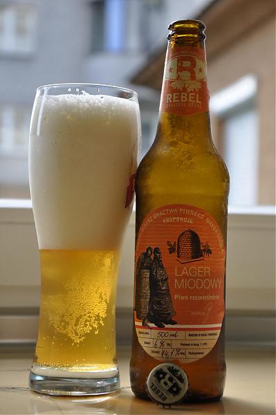 Kolor: jasnozłocisty, mętnawy, dla mnie mogłoby być ciut ciemniejsze ale ogólnie jest nieźle [4.5] Piana: obfita, drobna, lekkie ecru, opada szybko pozostawiając obwódkę wokół szkła [2.5] Zapach: słabo wyczuwany ale to co czuje jst dość przyjemne, słodowość z lekkim powiewem otwartego słoika modu, czyli jest delikatnie [3] Smak: totalne zaskoczenie, piwo jest dość miłe i przyjemne w piciu, w miarę pełne i treściwe, dominuje przygaszona słodem goryczka wymieszana pół na pół z delikatnym miodowym posmakiem, duzy plus bo wreszcie w tym piwie podstawą jest samo piwo a nie dodatek smakowy, drugi plus, nie czuć żadnej chemii [4] Wysycenie: troszke za duzo [4] Opakowanie: seria z piwem rzemieślniczym bawi mnie, bo jakie to piwo rzemieślnicze, etykieta jak i cala seria podoba mi się, firmowy kapsel [4.5] Uwagi: Jak nie lubię piw miodowych to te mi smakowało, jak dotąd najlepszy produkt z serii REBEL