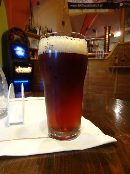 "O - skończyło się, ale zaraz podepnę nowa beczkę" - stwierdziła pani za kontuarem - i za chwilę z pełnym szkłem zasiadłem w przylokalowym ogródku. Twierdzę, że był to najlepszy amber ale jaki piłem ( a było tego trochę ... ). Dotychczas postrzegałem ten gatunek jako taki zupełnie bez wyrazu - a tu - świeży, cytrusowy, wyrazisty ( a piwo było podane w dość niskiej temperaturze ) aromat, w smaku cytrusy, lekki, nieprzesadzony karmel i wyrazista ( mimo deklarowanych 42 IBU ) grejpfrutowa goryczka. Dosłownie pochłonąłem