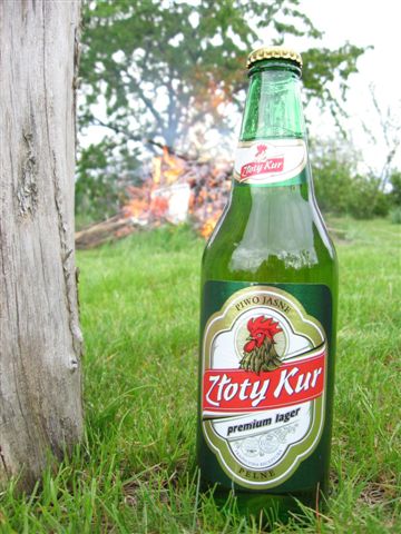 Przyznam, że do Kura podchodziłem z taką, można by rzecz cytując "klasykę" polskiej reklamy, pewną nieśmiałością ... Bo to i browar w regionie mało znany i dość odległy ... Ale akurat niepotrzebnie się obawiałem, bo Kur okazał się nad wyraz dobrym piwem. Zwłaszcza, że miałem okazję spożywać go na ogródku, przy ruszcie z mięsiwem, schłodzonego pod pompą lodowatą wodą. Od razu moją uwagę i sympatię wzbudził słodowy aromat doprawiony mocnym chmielowym akcentem. Tę gorycz od chmielu w trakcie picia czuć nieco mniej, bo jest łagodzona lekkim ziołowym posmakiem (goździkowym?). Piana można by rzec przeciętna, ale akurat w moim przypadku wzorcem piany w polskich piwach jest Brackie ... Opakowanie estetyczne, kolorowa etykieta, tylko te wierszyki jakieś takie nijakie ... No i dziwi dlaczego butelka typu EURO a bezzwrotna?