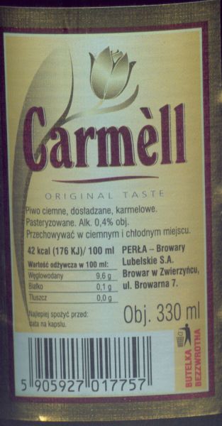 Browar w Zwierzyńcu ,zaw alk 0,4% obj .Może się nie znam na karmelkach ale jak dla mnie zupełnie podobne do Okocim Karmi .Po wykonaniu kilku telefonów dopiero znalazłem hurtownię w Lublinie gdzie można to kupić ,cena na półce około 1,60 zł.Podobno ma byc dostępne w każdej hurtowni która jest dystrybutorem Perły .