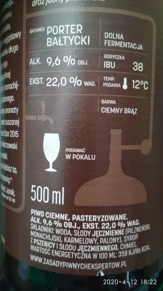 Warka do 03.01.2020 jak dla mnie rewelacja. W aromacie szlachetna gorzka czekolada, w smaku podobnie, ale dochodzi jeszcze kawa. Goryczka wyraźna, alkohol lekko szczypie, ale leżak na pewno pomoże. Dawno nie piłem tego piwa świeżego w tak dobrej formie. Nic tylko brać i leżakować.Comment