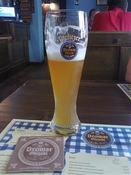 Będąc w browarze/restauracji wziąłem butelkę 0,7 jasnego na wynos, a pszeniczne wypiłem do obiadu na miejscu. Całkiem smacznego, tak na marginesie (zestaw: rolada po śląsku, naturalnie nadziewana ogórkiem i boczkiem, z gęstym sosem piecz., kluskami i kapustą).