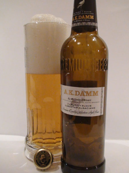 ). Kapsel z portretem Augusta K. Damm. Na etykiecie, krawatce i kontrze info, że to piwo o alzackim charakterze (ki diabeł?). Wszędzie wizerunek bociana