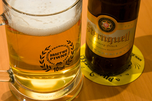 Jako, że za oknami wiosna na całego (wczoraj na działce naliczyłem 5 kwitnących gatunków roślinek, w tym pierwiosnki), to chyba nie będzie nietaktem wypicie Sommerbiera, czyli lekkiego (3,6% alk vol.) pilsa. Tak po prawdzie skończył się termin przydatności a nie miałem odwagi odłożyć degustacji do czerwca