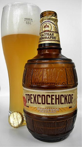 Tym razem pszeniczne z Rosji, z Uljanowska nad Wołgą. Fajna, beczułkowata butelka, opakowana w złociste elementy. Trehsosenskoje ma 4,8% alkoholu przy 12% ekstraktu. Więcej nie da się odczytać z etykiety, albowiem nigdy w życiu nie spotkałem się z tak drobną czcionką, nawet na piwach ze Wschodu, na których lilipucie krzaczki to norma.