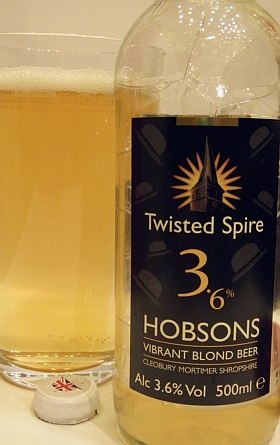 ) elementem całości. Przeźroczysta butelka z estetyczną etykietą, na której rzeczona iglica w aureoli. Do tego rzucająca się w oczy biała owijka z Union Jackiem, obejmująca także kapsel. Na kontrze pomocnik degustacyjny i krótkie nawiązanie do nazwy piwa.Słabe piwo. Najsłabsze z Hobsonsa jakie miałem okazję pić. Pomimo tego, że blond ale jest dość dyskretnym stylem, to takie cienkusze jak ten są już pewną przesadą. 6 w skali 1-10 i chyba przy okazji wybiorę się do kościoła NMP w Cleobury Mortimer. Może mnie bardziej zakręci.