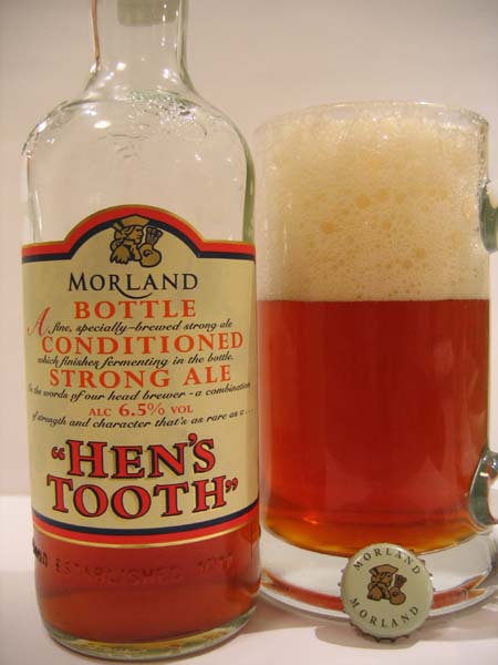 Kolejne piwo z browaru Morland, po Old Speckled Hen (stara siemieniata/cetkowana kura), majace kure w nazwie. Wg tekstu na etykiecie i dolaczonej nawieszce takie polaczenie mocy, charakteru i jakosci jest rzadkie jak tytulowy zab kury. Nie znalem takiego idiomu, za to czesto slysze ze cos jest 'rare as a rocking horse poo' - rzadkie jak kupa konia na biegunach. Tez by mogla byc niezla nazwa dla real ale, calkiem w angielskim stylu