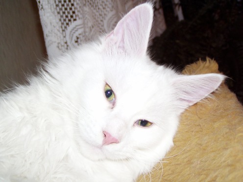 Wczoraj się dowiedziałam że u białych kotów oczy mogą być: pomarańczowe, niebieskie lub różnokolorowe (każde oko inny kolor). To podobno uwarunkowane genetycznie, podobnie jak głuchota. Na szczęście mój łobuz głuchy nie jest - zawsze ustłyszy otwieraną lodówkę.