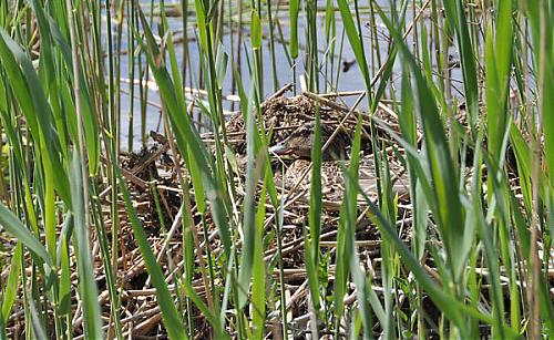 Jezioro ma 5 kilometrów linii brzegowej z tylko 300 metrów (łącznie na kilku odcinkach) jest pozbawione pasa trzcin szerokiego na 20-30 metrów. I właśnie w jednym z takich miejsc, wśród kilku zaledwie roślin, kaczki prowadzą lęg. A niech je gęś kopnie.Comment