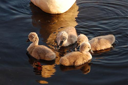 Za to zaczęła się pojawiać łabędzia rodzina. Martwiliśmy się wcześniej, że widać tylko jednego łabędzia, a to po prostu ten drugi cały czas siedział na gnieździe. Teraz przypływają w komplecie - rodzice i czwórka młodych.
